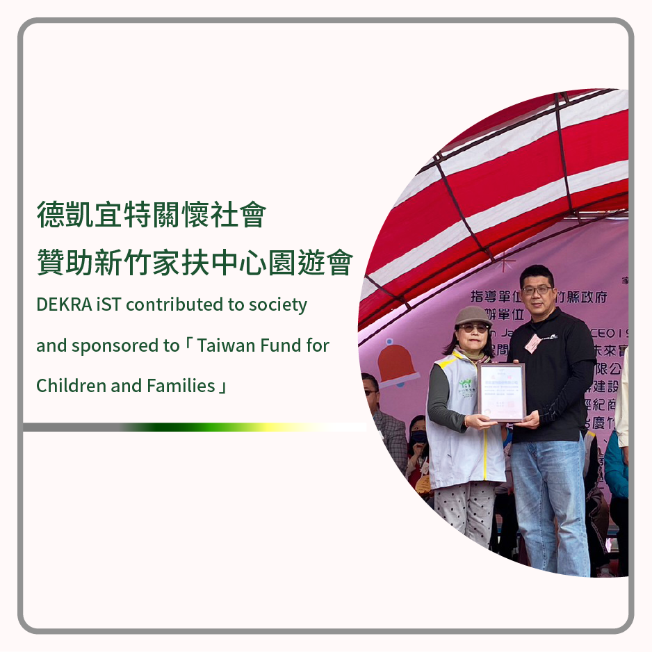 DEKRA iST德凱宜特持續關懷社會、投入公益活動,贊助新竹家扶中心於2023年11月26日舉辦的公益盛事「冬暖慈幼園遊會」,並提供園遊券邀請全體同仁以實際的行動傳遞幸福與溫暖,一同為弱勢家庭提供扶助。未來DEKRA iST德凱宜特在實踐Quality Doctor for a Better Life企業使命的同時,亦秉持「取之於社會,用之於社會」的回饋精神,持續投入公益活動。
