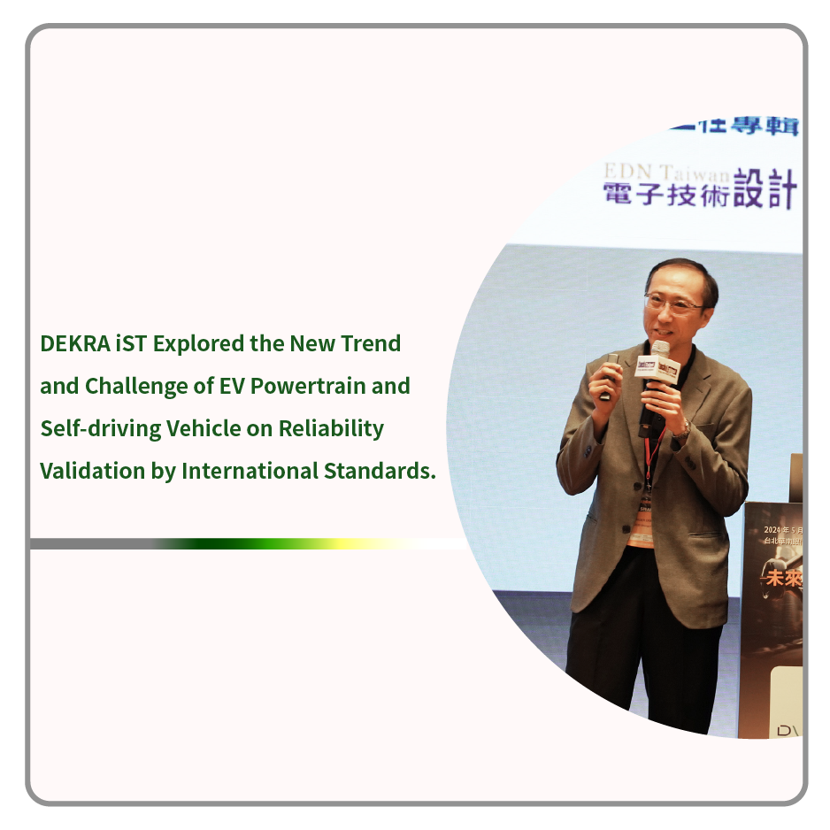 5月30日DEKRA iST德凱宜特受邀參加EETimes於華南銀行國際會議中心所舉辦的「未來車發展技術國際論壇」,高功率工程部陳旺助處長與現場聽眾分享「電動車與自駕車對應國際規範時,可靠度驗證的新趨勢與挑戰」。除了分享汽車產業上的技術發展、逐步點出汽車電子通用的國際規範ISO 16750改版內容的差異處,並與聽眾分享在車規測試上,客戶端經常遇到的問題以及DEKRA iST德凱宜特如何有效地解決測試驗證上各種瓶頸。