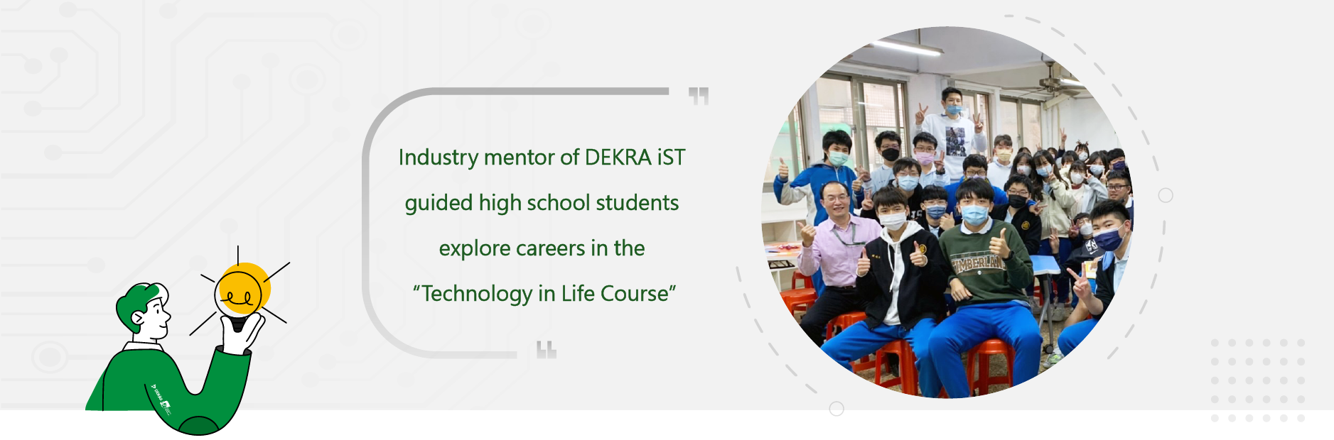 德凱宜特受財團法人電路板環境公益基金會邀請,由互連工程部彭思堯Michael Perng經理擔任業界導師,參與「科技in Life 高中職生涯探索」計畫。Michael身為兩個孩子的父親,十分重視教育議題,義不容辭投入公益教育,帶領高中生們一窺可靠度驗證產業。