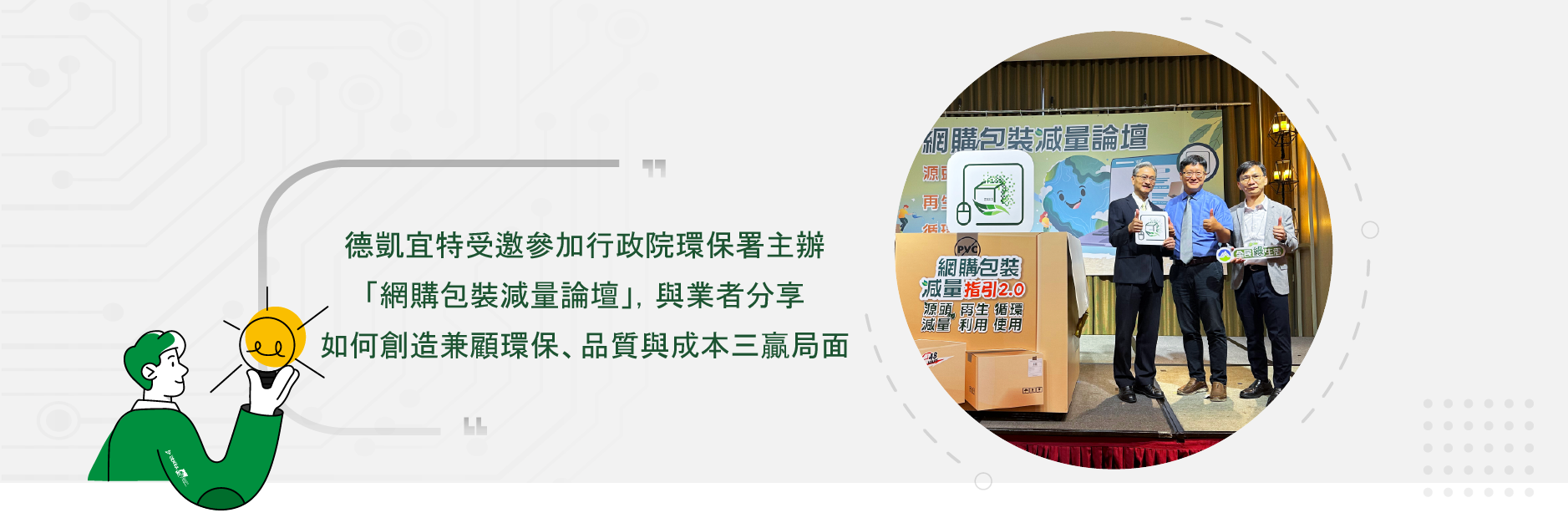 德凱宜特受邀參加行政院環保署主辦「網購包裝減量論壇」,與業者分享如何創造兼顧環保、品質與成本三贏局面