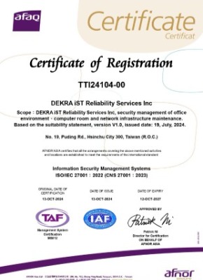 DEKRA iST德凯宜特于 2024 年取得 ISO/IEC 27001信息安全管理系统(ISMS)认证,依据ISO/IEC 27001三大要素,为确保资料的保密性、完整性与可用性,我们建立了信息安全管理措施,确保信息资产安全,降低数据泄露的风险,彰显我们对于信息安全的高度重视,也提高客户对DEKRA iST德凯宜特在信息安全保障的信任。