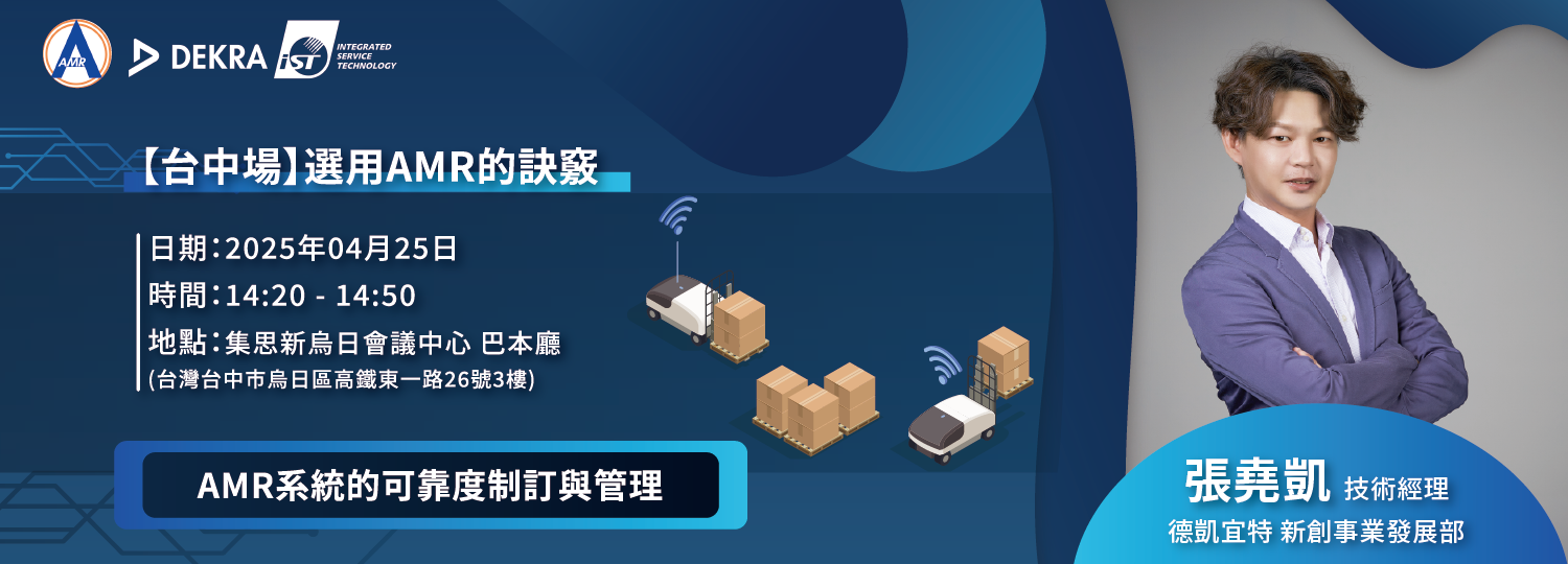 此次DEKRA iST德凯宜特荣幸受邀参加AMRA自主移动机器人联盟研讨会- 「选用AMR的诀窍」,张尧凯技术经理将以「AMR系统的可靠度制定与管理」为题,深入探讨如何制订与评估AMR系统的可靠度,并说明如何藉由可靠度验证,协助业者提升产品品质、突破技术瓶颈。