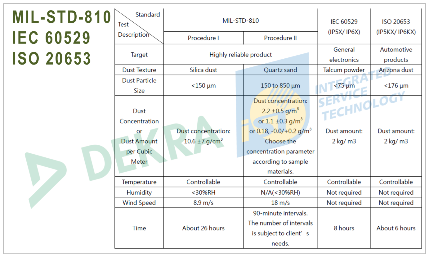 Unlike IEC 60529 used for general electronic products and ISO 20653 used for automotive products, MIL-STD-810 Procedure II is a series of tests designed by the United States Department of Defense. The performance and reliability of a product will be tested for storage and operation functionalities with larger particle sizes (150 to 850 μm) and higher wind speed (18 m/s) under high temperature environments. A detailed comparison is summarized in Figure 4:
