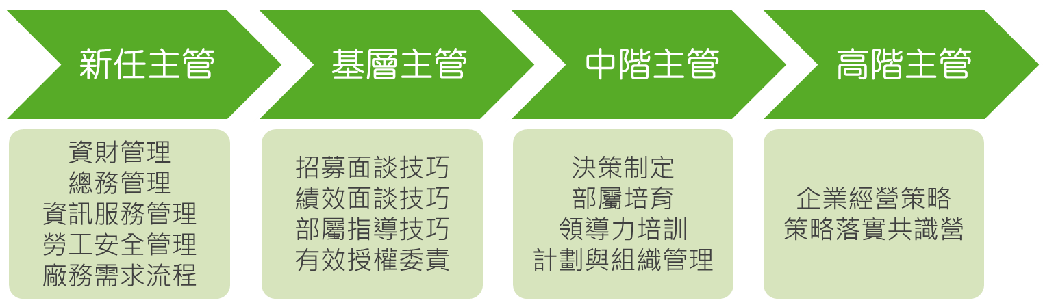 - 中階主管訓練 : 由於中階主管擔負著承上啟下的中堅任務,學習如何帶領部屬達成設定之目標。