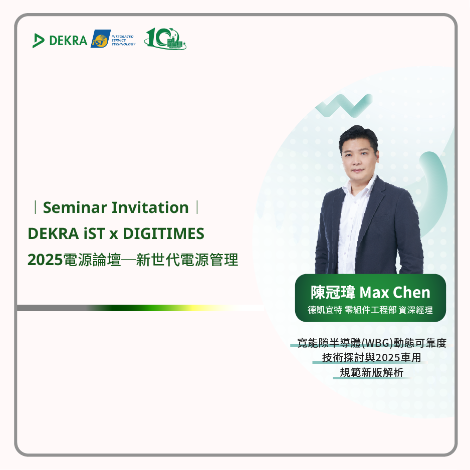 DEKRA iST德凯宜特受邀参加DIGITIMES「电源论坛─新世代电源管理」,陈冠玮资深经理将与来宾分享「宽能隙半导体(WBG)动态可靠度技术探讨与2025车用规范新版解析」,深入剖析WBG元件的可靠度技术及国际标准最新动态,诚挚邀请您参与这场研讨会,与产业先进共同掌握技术演进脉动,强化设计实力,抢占绿色电源新世代先机!