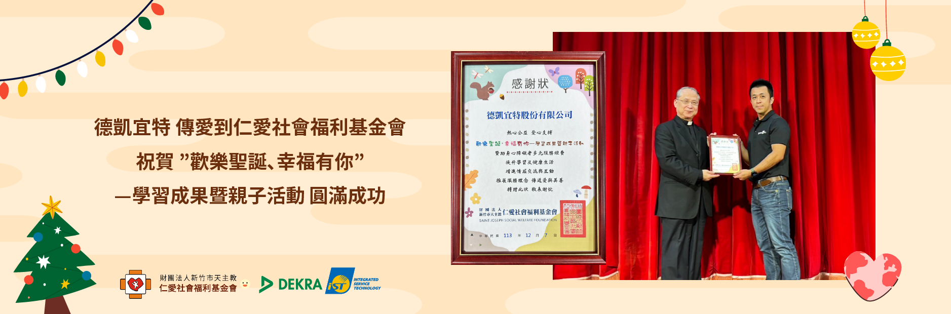 仁爱社会福利基金会举办欢乐圣诞•幸福有你─学习成果暨亲子活动,身心障碍朋友们透过感人的话剧及精彩的舞蹈演出,展现自我,增加信心与成就感,并邀请家属、志工及爱心单位一同欢乐互动。此次活动见证了爱与支持是如何为身心障碍朋友们的成长注入更多希望与勇气,DEKRA iST德凯宜特深信每一份关怀与付出都是生命中的一束光,既照亮他人也温暖了彼此的心,邀请大家一起将温暖与爱心持续传递下去!
