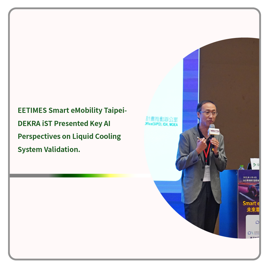 On June 4, DEKRA iST was invited to participate in the “Smart eMobility Taipei”organized by EETimes at the HNBK International Convention Center. WangChu Chen, Director of High Power Engineering Department, delivered a talk titled “New Insight for AI Technology - Leverage Automotive Experience to Reinforce Reliability of Liquid Cooling Solution” He highlighted the rising importance of reliability engineering, explored cutting-edge trends in liquid cooling solutions, and shared how lessons can be applied to help clients stay ahead of the novel challenges brought by AI technologies.