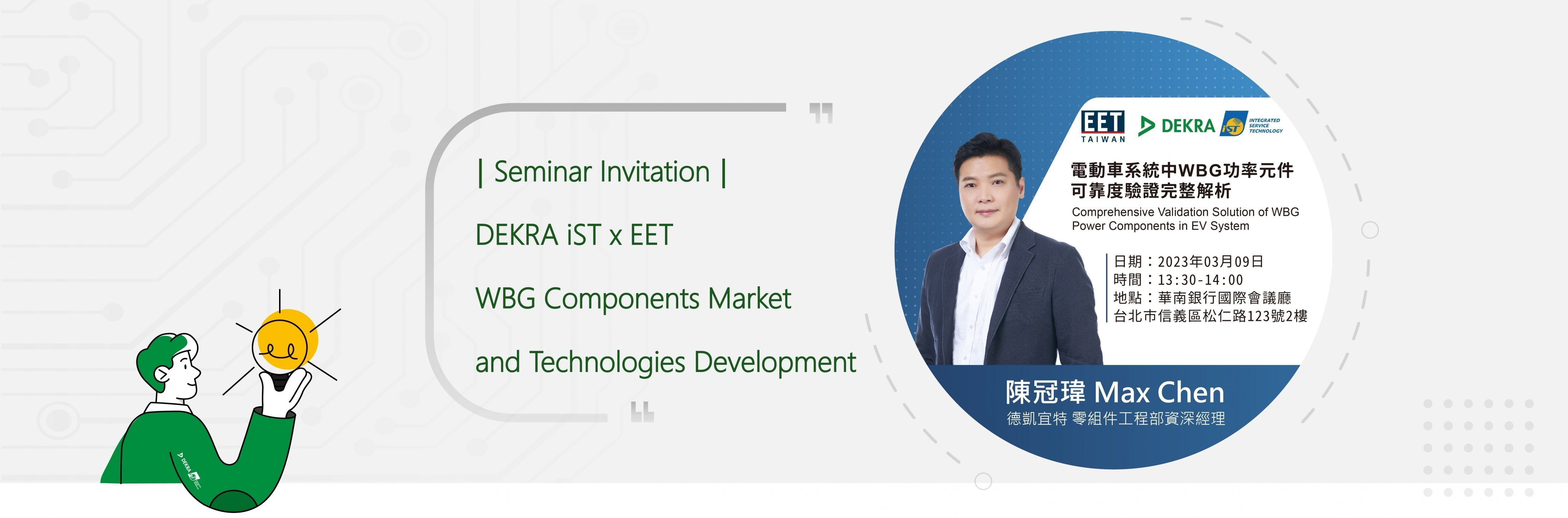 On March 9, the Industrial Development Bureau of the Ministry of Economic Affairs and EETimes jointly held the "International Industry Forum on Technologies and Future Applications Trend of Wide Bandgap Components" at the Hua Nan Bank International Convention Center. DEKRA iST was invited to share "Comprehensive Validation Solution of WBG Power Components in EV System," which drew a packed audience and received critical acclaims.