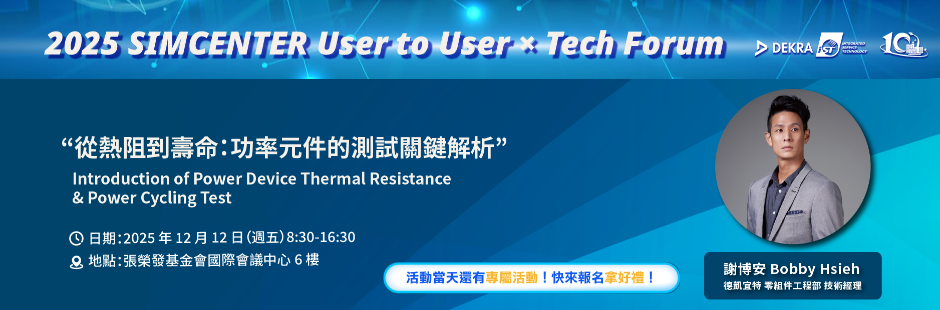 DEKRA iST德凱宜特受邀參與協力廠商勢流科技「2025 SIMCENTER User to User × Tech Forum」,由謝博安技術經理擔任講者,將以實務經驗出發主講「從熱組到壽命:功率元件的測試關鍵解析」,深入探討功率元件在驗證流程中的挑戰與要點,協助與會者掌握提升產品可靠度的核心策略。